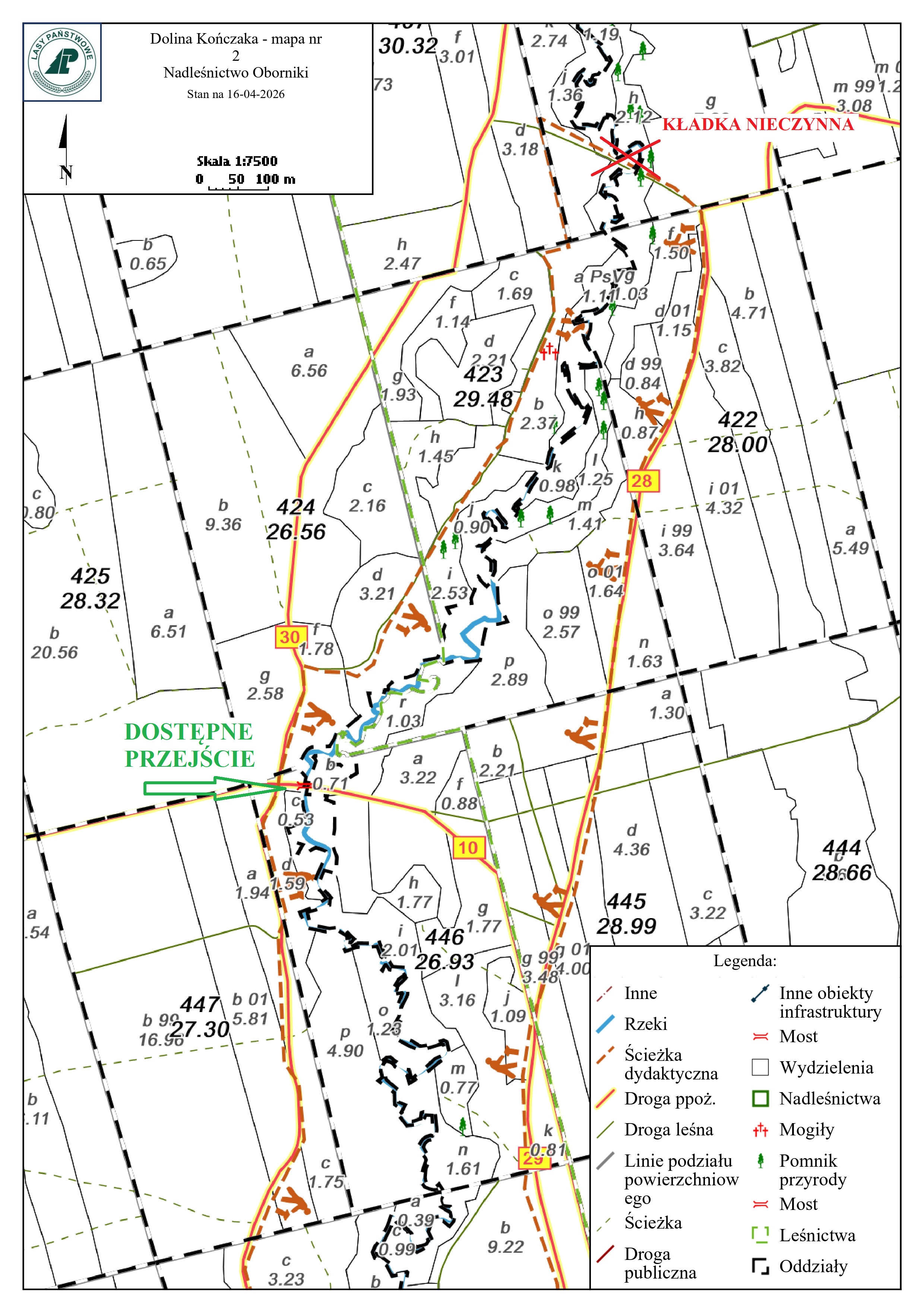 Obecnie przejście przez Kanał Kończak możliwe jest jedynie w miejscu przepustu w północnej części dotychczasowej ścieżki (przepust na tzw. drodze białej, czyli pożarowej nr 10). Szczegóły na załączonych mapach.