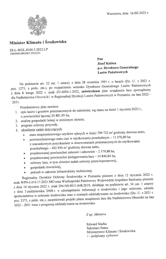 Nadleśnictwo Oborniki prowadzi gospodarkę leśną w oparciu o aktualnie obowiązujący Plan Urządzenia Lasu na okres od 1.01.2022 – 31.12.2031 r. zatwierdzony Decyzją Ministra Środowiska nr DLŁ-WGL.8100.3.2022.LP